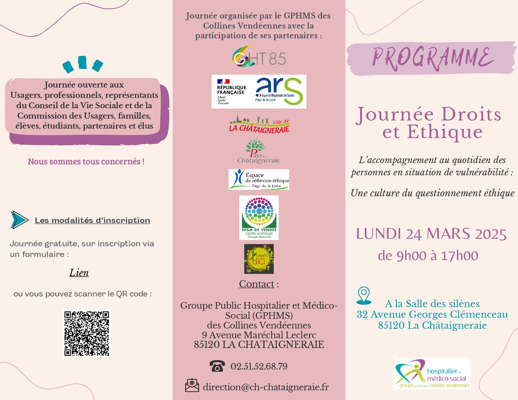 Le Groupe Public Hospitalier et Médico-social des Collines Vendéennes organise une Journée autour de l’Accompagnement au quotidien : les enjeux de Droits et d’éthique, avec la participation de Madame Karine LEFEUVRE, Docteure en droit, professeure à l’École des Hautes Etudes en Santé Publique et une expérience confirmée dans plusieurs comités d’éthique et plusieurs acteurs de la région Pays de la Loire !